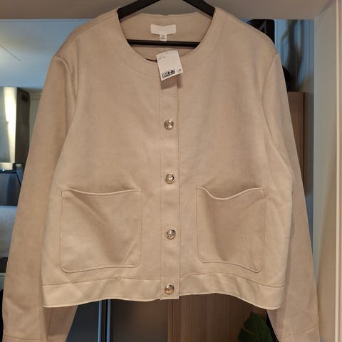 Jakke for dame i størrelse XL. Jakken er i en myk, lodden tekstur i grå farge,warm alpakkajakke.Den har knappelukking foran med synlige knapper og snøring i livet for justering av passform. Jakken har store frontlommer og knappedetaljer nederst på ermene. Lengden går ned over hoftene, og modellen passer godt som en lett ytterjakke eller overgangsjakke.
