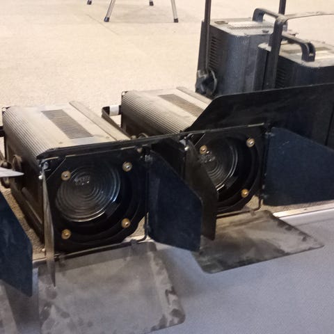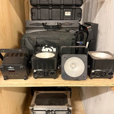 4 scenelamper (fresnel) selges. Lampene er LED 85W og styres over DMX. Fargetemperatur kan stilles fra varmhvit til kald. De har også strobefunksjon. Nypris 2200. Selges for 1500 per stk.