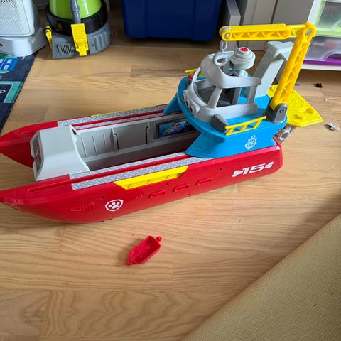 Paw Patrol lekebåt med flere deler og tilbehør. Settet inneholder en stor redningsbåt i rødt og blått med kran og styrhus, en liten kjøretøyfigur, en figur av en blekksprut samt diverse tilbehør som anker og ringer. Lekebåten er egnet for rollelek inspirert av Paw Patrol-universet for barn som liker kjøretøy og redningslek.