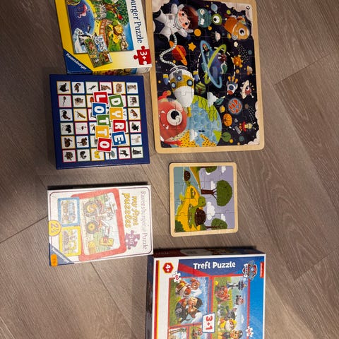 Selger 4 puslespillet av ulik vanskelighetsgrad. Passer for barn 1-3 år. Alle er i tre. Esken til ene er noe ødelagt men innholdet er komplett.