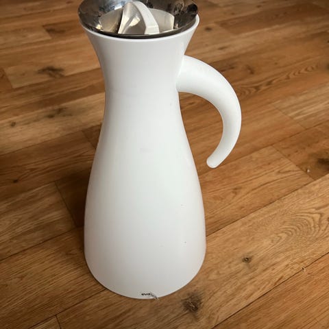 Eva Solo termokanne i to farger, hvit og rød. Kannen har et slankt, buet design med integrert håndtak og lokk. Egnet til servering av varme og kalde drikker på kjøkken eller spisebord. Materiale fremstår som hardplast med isolerende innside. Passer til daglig bruk eller ved servering til flere personer. Selges samlet for kr 400,-