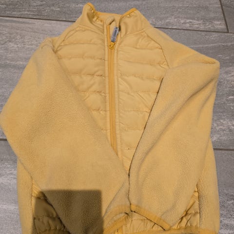 Reflex fleecejakke for barn i størrelse 140. Jakken er gul og laget i myk fleece. Den har glidelås i front og høy krage. Foran er det to lommer med glidelås. Både foran og bak har jakken vatterte felt som gir ekstra isolasjon. Passer som lett jakke eller mellomlag for unisex barn i ca. 140 cm høyde.