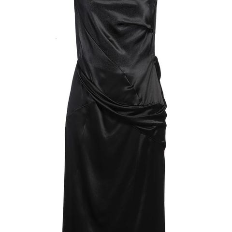 Zara festkjole i beige, damemodell i one size. Kjolen er laget i polyester og har et asymmetrisk design med tynne stropper og drapert utringning. Lengden går omtrent til leggen, og stoffet er lett og glatt. Passer som penkjole til formelle anledninger eller fest.