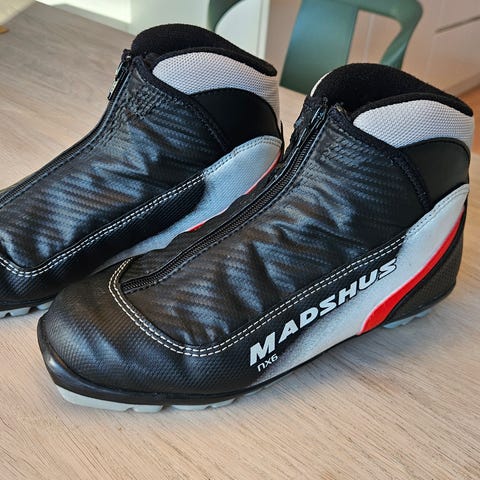 Fine, klassiske skisko str 40 fra Madshus selges. De er lite brukte og ser pene ut, men inni på det røde stoffet er det litt svarte tusj-merker etter «navning» - se nærbilde. Dette har ingenting å si for bruken, er bare til info.