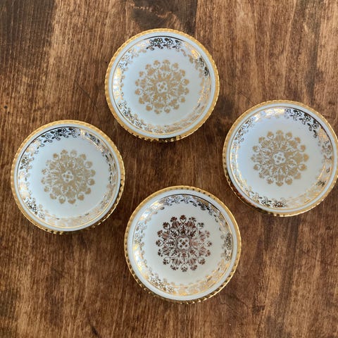 6 stk vakre vintage drikkebrikker med pene detaljer. Også fine til å ha lys eller ringer på. Noe patina kan forekomme, men pent brukte. Se bilder for mål. ✨