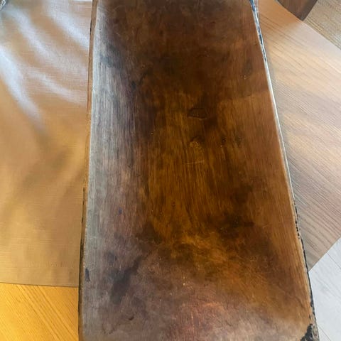 Rektangulær form med avrundede kanter og utskåret fordypning. Overflaten har synlige bruksspor og patina. Lengden er målt til omtrent 100 cm, og bredden til omtrent 40 cm, basert på målebåndet på bildene.