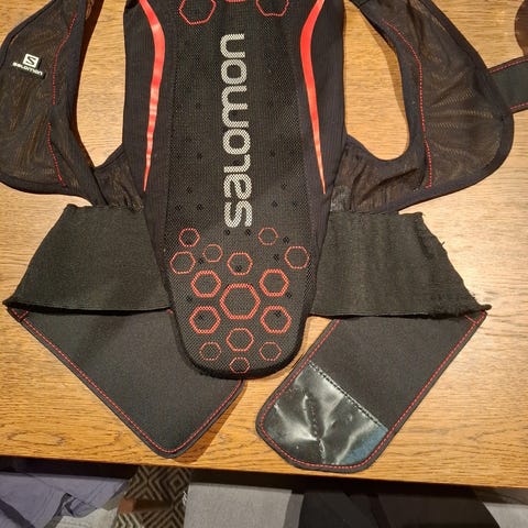 Protection Gear ryggskinnevest i størrelse XXS (104–128). Vesten har integrert ryggbeskyttelse og glidelås foran. Fargekombinasjon rød og svart. Egnet som beskyttelsesutstyr til barn ved aktiviteter der ryggbeskyttelse er ønskelig.