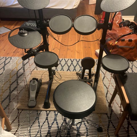 Elektronisk trommesett med flere trommepad-er og cymbalpad-er montert på stativ. Settet inkluderer trommemodul, kabler, trommestikker og doble pedaler. Det følger også med trommekrakk. Egnet for øving hjemme og tilkobling til hodetelefoner eller forsterker. Passer for både nybegynnere og mer erfarne brukere som ønsker et kompakt trommesett med justerbare komponenter