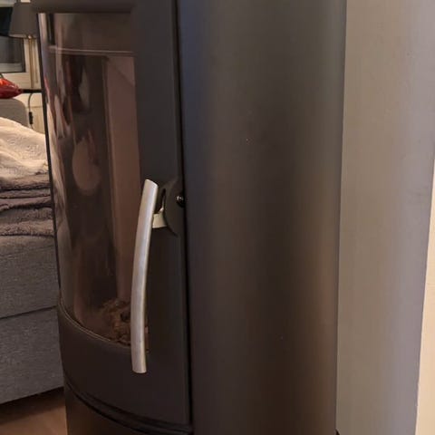 Frittstående vedovn i svart utførelse. Ovnen har buet front med store glassflater på begge sider for godt innsyn til flammene. Røykuttak er plassert på toppen av ovnen. Passer for montering mot vegg i stue eller andre oppholdsrom der det er behov for vedfyring og ekstra.