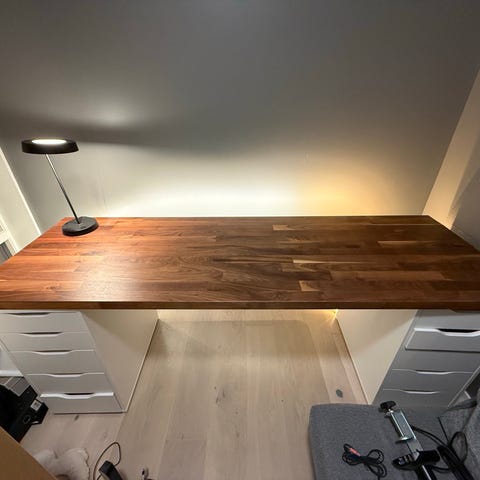 Stor bordplate som brukes sammen med tre bein og én skuffeseksjon som støtte. Perfekt som romslig kontorpult eller hobbybord. Stabil og praktisk løsning.