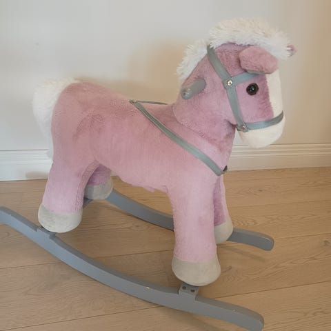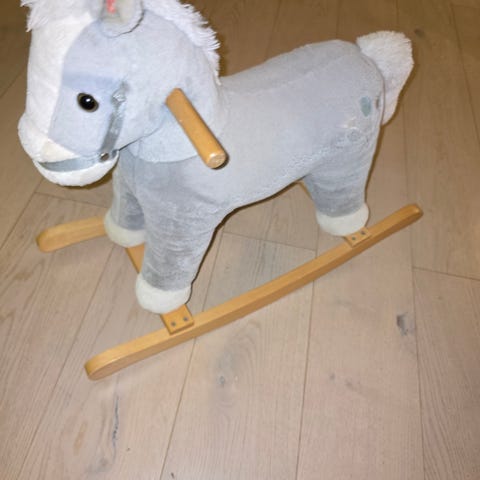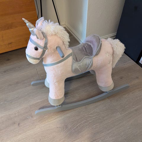Gyngehest av en enhjørning fra Teddykompaniet. Har lydeffekter som jeg tror fungerer fint om man bare byttet batterier. Høyt elsket og godt brukt, men ingen flekker eller særlig slitasje, og masse bruk igjen.