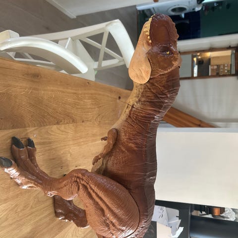 Dinosaur lekefigur i stor størrelse i grå farge med rosa innside i munnen og lysegrønne tenner. Figuren forestiller en kjøttetende dinosaur med åpen munn, klør på forbeina og lang hale. Passer som lekedyr, dekorasjon på barnerom eller som samlefigur for dinosaurinteresserte.