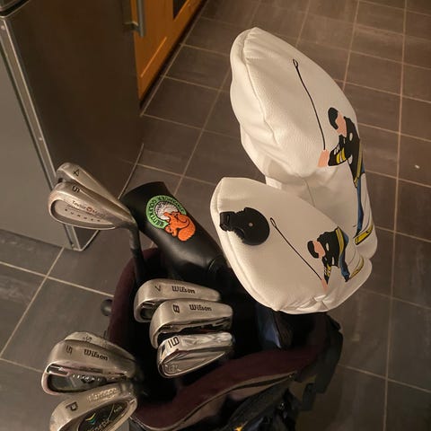 Sett med ulike jern og wedger fra flere merker, blant annet Titleist, Wilson, Palmer og Olyo. Driveren er en Callaway X Series modell - nypris ca 2 500,-.