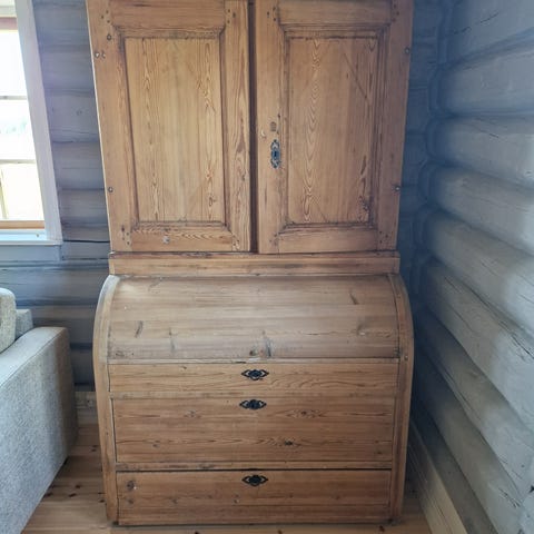 Flott eldre skap i heltre med utskjæringer.