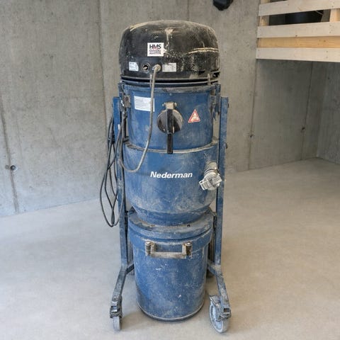 Nilfisk GM 623 industristøvsuger i grå utførelse. Modellen er en kraftig støvsuger beregnet for industriell eller profesjonell bruk, med stor beholder montert på tralle for enkel forflytning. Enheten har toppmontert motorhus med luftutslipp gjennom rist, samt tilkobling for slange på siden. Det følger med slange som vist på bildene. Strømtilkobling via kabel. Egnet til oppsuging av tørt støv og smuss i verksted, lager eller lignende miljøer, innenfor spesifikasjonene angitt på typeskiltet på maskinen.