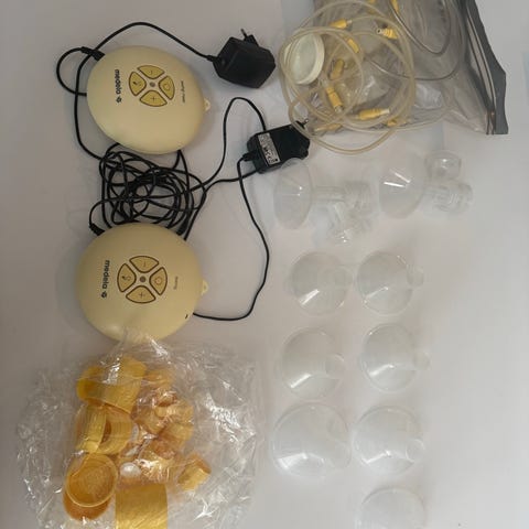 Medela Swing elektrisk brystpumpe med tilbehør. Settet inkluderer elektrisk pumpeenhet, brysttrakt(er), slanger, ventiler og flere Medela tåteflasker med lokk og stativ. Brystpumpen er beregnet for pumping av morsmelk hjemme eller på farten og kan brukes som enkel elektrisk pumpe. Manual følger med i esken, sammen med strømforsyning og diverse smådeler som hører til systemet.