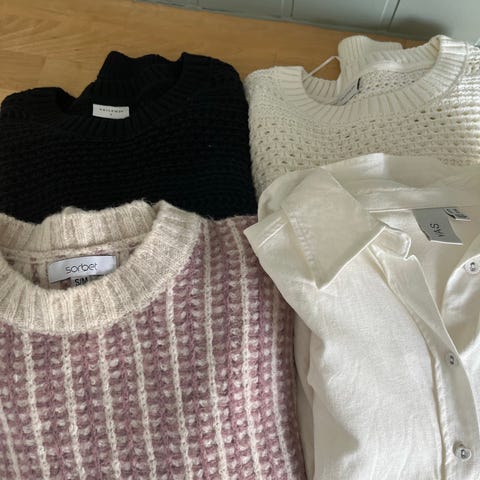 Vailent genser for dame i størrelse XL. Genseren er hvit. Den har rund hals, lange ermer og ribbestrikkede kanter i hals, ermer og nederkant. Passer som en enkel og nøytral hverdagsgenser.