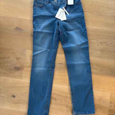 Buksa er i bomull og har størrelse 40 med livvidde W32. Klassisk 5-lommersmodell med beltehemper i linningen. Foran har jeansen små dekorsteiner/nagler ved lommen. Bak er det to påsydde lommer og en liten skinnpatch med Gerry Weber-logo i linningen.