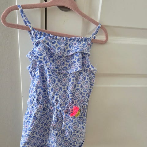 Primark jumpsuit for jente i størrelse 146. Jumpsuiten er flerfarget med mønster og er laget i viskose. Den har smale stropper over skuldrene med strikk, strikk i midjen og kort benlengde. Stikklommer i sidene. Fin detalj med åpent felt i ryggen. Lett og luftig.