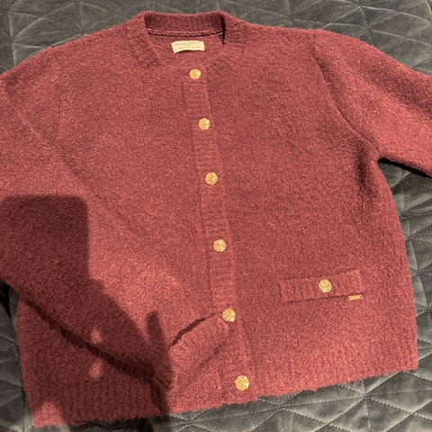 Holly & Whyte cardigan for dame i størrelse M. Cardiganen har brede horisontale striper i to farger(lilla og hvit) og rund hals. Den lukkes med gylne knapper foran og har ribbestrikkede kanter ved hals, ermer og nederkant. Gullhjerte brodert foran. Egnet som et lett lag over topp eller skjorte til hverdagsbruk. Veldig behagelig og myk. Passer også en L da den er god i str.