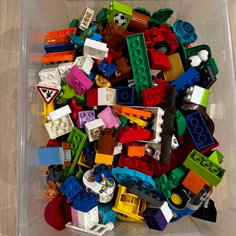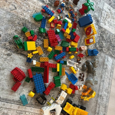 LEGO DUPLO klosser blandet sett i ulike former og farger. Inneholder blant annet standardklosser, plater, figurer og noen spesialdeler som dyr og blomster.