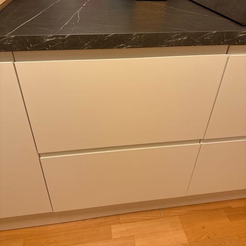 Kjøkkeninnredning med underskap og benkeplate i vinkel. Skapene har hvite, glatte fronter med knotter og justerbare ben. Løsningen består av både skap med dører og skuffer for oppbevaring. Benkeplaten er grå laminat. Innredningen egner seg som kjøkken, grovkjøkken eller arbeidsbenk i bod eller hobbyrom.
