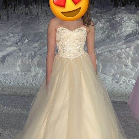 Aleksandra Ritzi kjolen. Den er i størrelse XS, men har justerbar rygg og passer derfor også XXS til M. Jeg er 160 cm høy og brukte høye hæl sko på ca. 5 cm