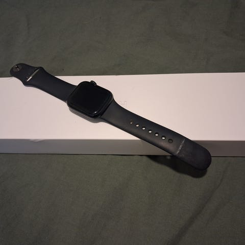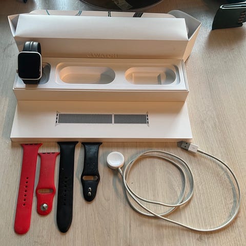 Apple Watch smartklokke. Den har gps og jeg tror at det har esim som gir den mulligheten til å fungere uten mobil. Blir solgt med lader