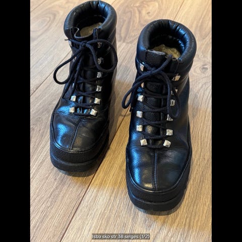 Holzweiler Sinsen vinterstøvler i størrelse 36. Støvlene er svarte med kraftig, mønstret yttersåle og snøring med metallhemper foran. Skoen er i svart skinn, og innsiden har myk, varm fôring. Modellen er superkul, men skoene er for små etter svangerskap, dessverre.