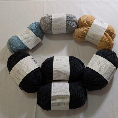 På min vekt veide garnet 414 g. De selges samlet slik som vist på bilde 1.