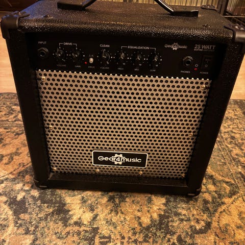 Kompakt elektrisk gitarforsterker egnet for øving hjemme eller i mindre rom. Forsterkeren har kontrollpanel med volum-, tone- og gainkontroller, samt av/på-bryter. Kabinettet er i sort finish med bærehåndtak på toppen.