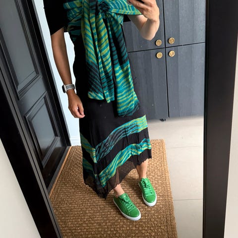 Kjolen er todelt: Skjørt og overdel kan brukes hver for seg eller festes sammen med knapper.
