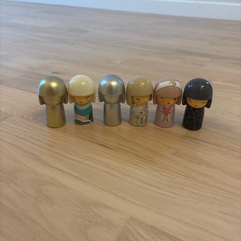 Kokeshi dukker, Settet inneholder seks dukker med varierende design, inkludert farger som hvit, sølv og gule detaljer. Dukker har tradisjonell japansk stil og kan brukes som dekorasjon eller samlerobjekter. Skincity