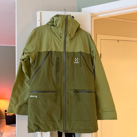 Haglöfs gore-tex skalljakke og skallbukse i oransje og lilla. Størrelse XL.
