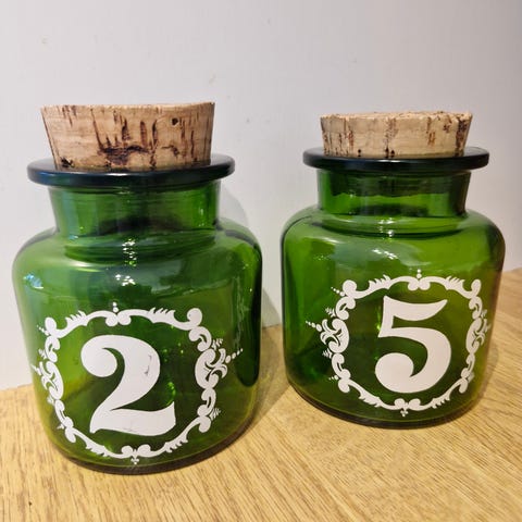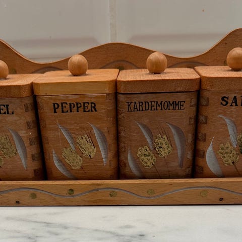 Flott sett retro kjøkken krukker i tre 50-60 tallet. Mener de er britiske, ikke merket. Måler fra størst til minsteinntekt høyde : 15, 12,5, 10,5, 8,5 cm. Bruksspor finnes, kun overflate, ellers hele og fine. Disse er også fine til oppbevaring av div ting, ikke nødvendigvis det de er tenkt for, men gjør seg godt på kjøkkenbenken…..😊👍