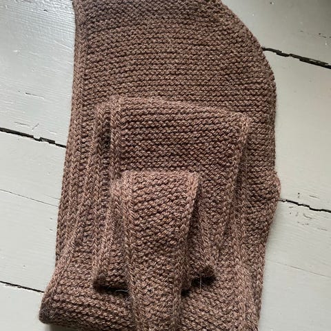 Sophie Hood (petiteknit) Strikket i drops karisma 100 % wool superwash. Lengde fra øverst på hetten til spiss er ca 112 cm og dybde på hetten er ca 25 cm .