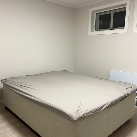 Jysk seng med overmadrass. Sengen består av en madrass på sokkel/ramme med en løs overmadrass oppå. Nøytral, lys farge på overmadrassen. Passer som dobbeltseng i soverom. Egnet for daglig bruk eller som gjesteseng, avhengig av behov og plassering.