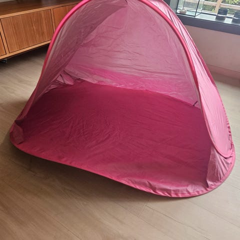 Uv telt fra konges sløjd, den minste størrelsen. Veldig praktisk størrelse, plass til to barn, i rosa farge. Pent brukt, men noen bruksmerker på bunnen.