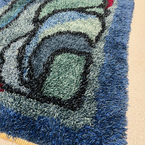 Søkeord: Retro, knyteteppe, knytteteppe, rye, floss, flosseteppe, håndlaget, håndknyttet, Rauma, berber, veggteppe, ullteppe, vintage, Rya, Sellgren, ull