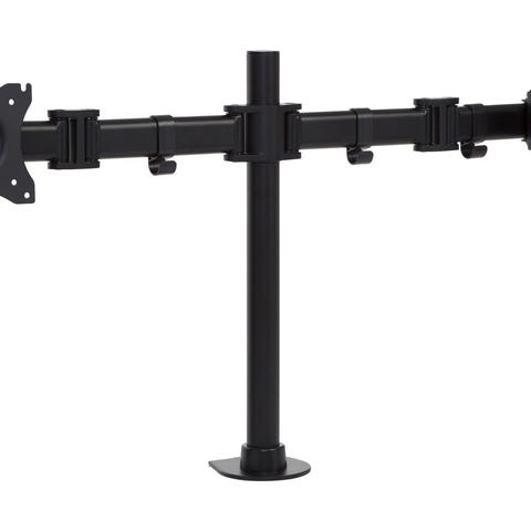 Skjermstativ for tre skjermer i svart farge. Stativet er beregnet for skjermer opptil ca. 27 tommer med VESA-feste. Består av vertikal søyle med fot og to horisontale armer med justerbare leddfester for skjermene. Leveres med monteringsplater, skruer og øvrig festemateriell som vist på bildene. Egnet for plassering av flere skjermer på skrivebord for kontor- eller hjemmebruk.