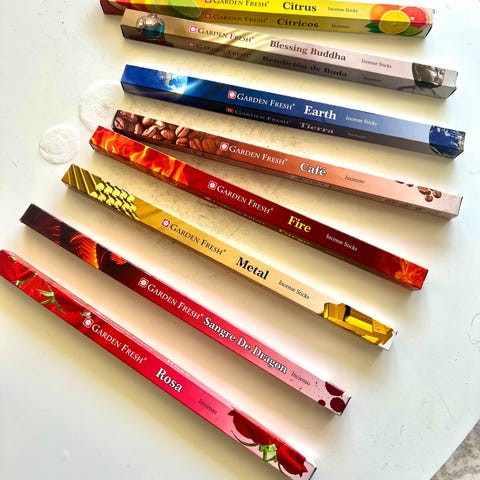 Pakke med diverse røkelsespinner i blandet utvalg. Flere ulike dufter og design på eskene, egnet for bruk med røkelsesholder. Passer til innendørs bruk der man ønsker duft og røyk fra røkelsespinner. Antall pakker og eksakte dufter fremgår av bildene.
