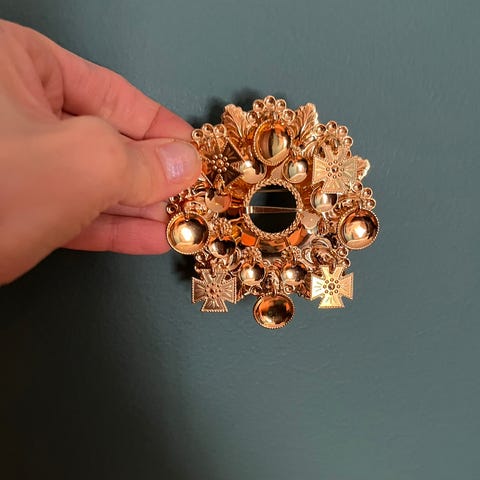 sølje med hjerte og krone. Stempel 830s på baksiden samt bokstavene J.A.B. Har blitt brukt til Hardangerbunad.