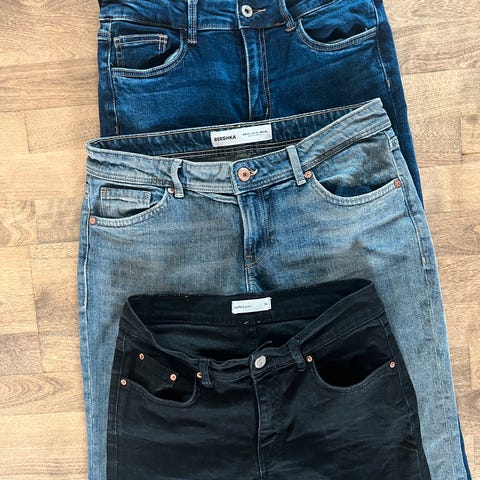 Str 28 (tilsvarer str 38). Blå jeans med smale ben, sort løsere med rette ben. Begge med detaljer på lommene.