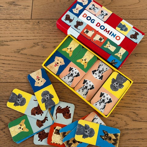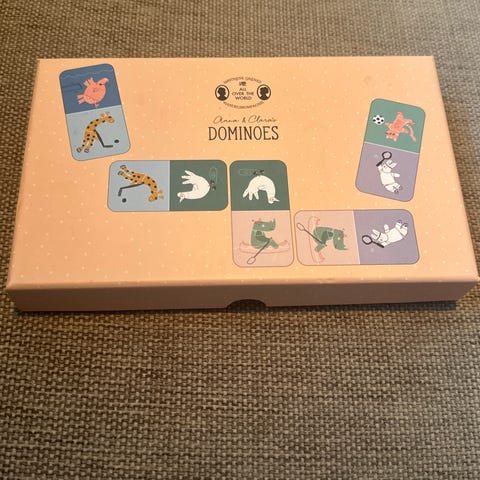 Domino Game dominospill med illustrerte dyremotiver. Spillet består av rektangulære brikker i papp med ulike dyr og farger som skal pares etter like motiver. Egnet som aktivitets- og læringsspill for barn, for å øve gjenkjenning, konsentrasjon og enkel spillforståelse. Leveres i eske for oppbevaring.