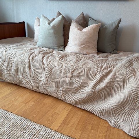 Madrass medfølger (190 x 74 cm). Trekket er grønt med mønster.