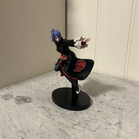 Naruto Haku figur med is-effekt på sokkel. Høyden er omtrent 13 cm, målt fra bunn av sokkelen til toppen av figuren. Figuren viser Haku i karakteristisk positur med blå og gjennomsiktige isdetaljer rundt. Egnet som samleobjekt eller utstillingsfigur for fans av Naruto-serien.