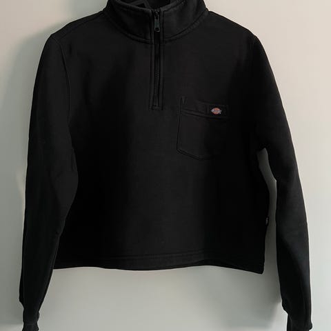 Detaljer: Liten Dickies-logo på brystet, kengurulomme foran og snøring i hetten.