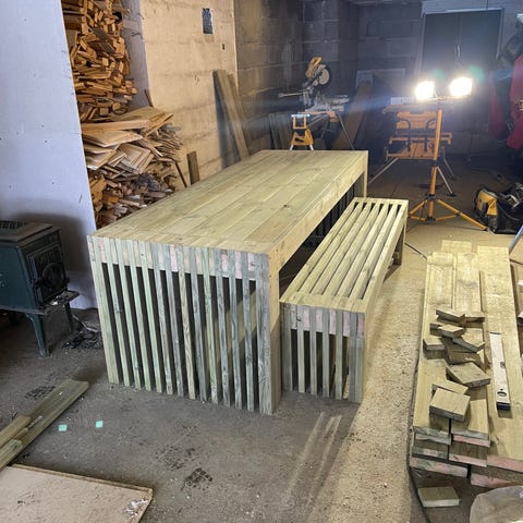 Bord/benk i tre med integrerte benker på begge sider av bordplaten. Kraftig, grovt tilhogd konstruksjon som står på solide trestokker. Bordet er egnet til utendørs bruk i hage, på hytte eller andre uteområder. Bordplaten består av brede treplanker, og sittebenkene er laget i samme materiale. Leveres i ubehandlet eller beiset utførelse, avhengig av variant vist på bildene. 210 brei og 250 lang. Kan behandles med tjæralin treolje for 1000kr ekstra. Ring for mer info.
