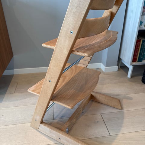 Stokke Tripp Trapp barnestol i naturfarget tre. Stolen har justerbart sete og fotbrett som kan tilpasses barnets høyde.