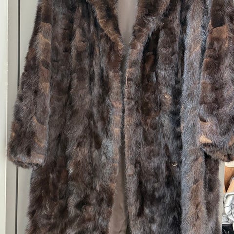 Selger denne nydelige minkkåpen, som jeg har arvet, for den passer ikke meg. Den er ekte, vintage trolig fra 60-70-tallet. Den har dobbeltspent front med dekorative knapper, men den festes med hekter inni. Der er også noen hemper utpå, hvor man kan ha belte. Inni er noen bånd jeg ikke vet hva er til 😅 kåpen har bred sjalkrage, og den er litt utsvingt/A-form (swing coat-snitt). Den har klassisk brun farge, og lengden er til ca midt på leggen, størrelsen trolig S. Jeg finner ikke noen lapper, men målene er: Lengde: 100 cm, vidde fra armhule til armhule: 40 cm, armlengde fra skulder: ca 50 cm og fra underarm ca 35 cm.